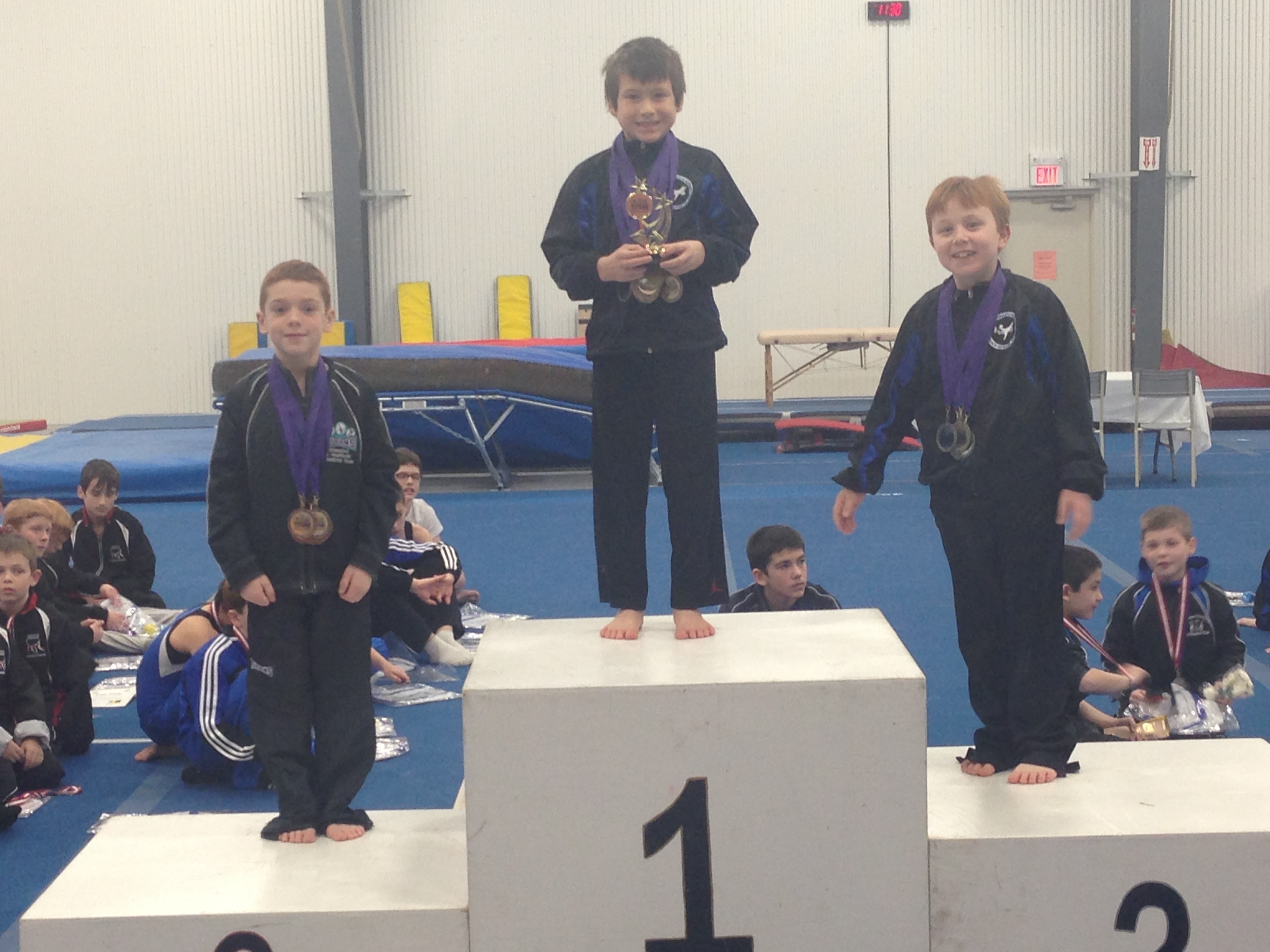 Gabriel Ing led the Level 1 under 10 boys with a first place finish in the all-around, as well as first on pommels and second on floor, vault, and high bar. Teammate Ethan Arsenault was sixth all-around and won a third place ribbon on pommels. Simon Burns won the Level 1 over 12 category with a first place finish all-around, after earning the top spot on floor, rings, and high bar, second place on parallel bars and third on vault. Ian McKenna was fifth all-around in the Level 1 over 12 category and placed third on floor and pommels. In Level 1 under 12, Ben Davidson was third all-around. Davidson also placed third on pommels, rings, vault, high bar and parallel bars and took second place on floor.
