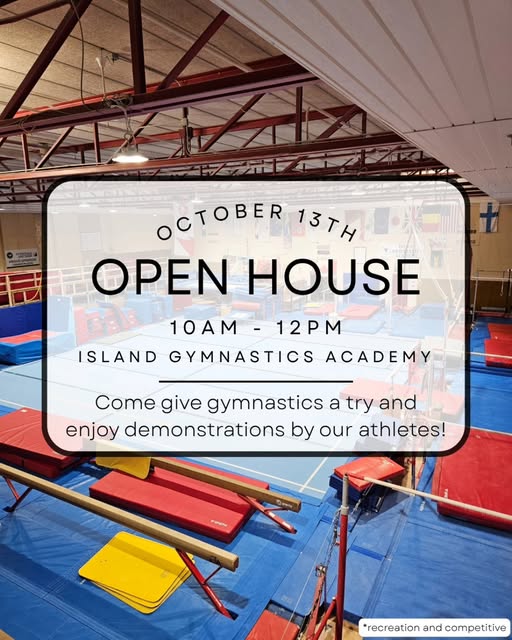 Join us on Monday, October 13th, from 10am-12pm to try gymnastics, use our new Olympic-standard equipment, and enjoy demonstrations by some of our competitive gymnasts!