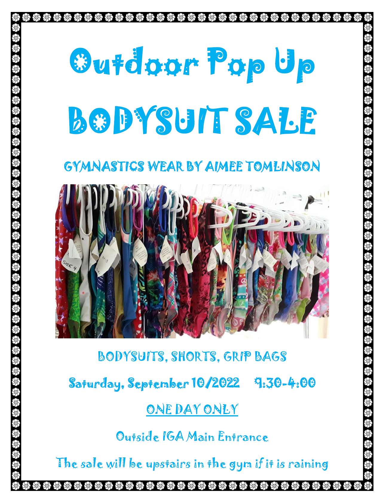We are happy to have Aimee Tomlinson return this year for our annual bodysuit sale. There will be training suits, shorts and grip bags in assorted sizes and prices!!